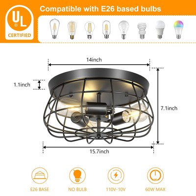 Elibbren Farmhouse Flush Mount Ceiling Light Fixture, 3-Light Black Industrial Cage Ceiling Light, 15.7" Vintage Close to Ceiling Light for Kitchen, Hallway, Dining Room, Bedroom (E26 Base, UL Listed) Industrial Metal Cage Style: Industrial ceiling fixture uniquely designed with a 3 E26 light bulb base, has a antique rustic retro look and meets your need of modern home d¨¦cor, adds vintage charm to your home.It is definitely the best choice for your home lighting and decoration. Bulb Type: 3 x E26 UL lamp base, compatible with LED ,Edison ,incandescent , CFL and halogen bulbs. Note: No bulbs. Wide Decor for Any Place: Edison style vintage ceiling light is great for kitchen, island, dining room,foyers ,hallway,bedroom,coffee bar, lobby, restaurant and and any space you like. Easy to install: The package includes all mounting hardware for quick and easy installation. If you have any installation problems can feel free contact us. Your Satisfaction After-Sale Service: Elibbren strive to offer a perfect purchase experience to each customers. If you have any questions or issues after receiving the items or installation, do not worry about it, please get in touch with us at any time. SHIPPING - We offer FREE shipping on all orders! - We ship within 3 business days of payment, usually sooner - We use a selection of shipping services such as UPS, FedEx, USPS etc - We only ship to the lower 48 states, no APO/FPO addresses or PO Boxes allowed International buyers – please note: Import duties, taxes, and charges aren't included in the item price or postage cost. These charges are the buyer's responsibility. - Please check with your country's customs office to determine what these additional costs will be prior to bidding or buying. - We have confidence in our products, but if you are not fully satisfied please contact us within 30 days of purchase and you will get full refund. * Order Cancellation Policy ** You can return a product for up to 30 days from the date you purchased it. 1. The seller reserves the right to cancel the special case only due to eBay cancellation fee. 2. The decision of seller is the final. 3. The seller will respond to the cancellation request within 2 business days. Please wait for the result of cancellation. 4. In case the cancellation is not completed by some reasons, the buyer can follow the options below to get the refund. 4.1 The buyer can reject the item when it arrives. 4.2 The buyer can send the item back to the seller within 30 days If the buyer receives item (USA Shipment ONLY). The seller will provide the FREE return label to the buyer when the buyer opens " Return Item" case on eBay by using the reason as "Change my mind" ONLY. 5. When buyer has placed the order. The order will be processed and completed by automatic warehouse system within 5 minutes. In case that buyer sends the cancellation request after 5 minutes of placing the order, the request will be rejected.**Sending direct message to cancel the order is not allowed for every case.* Return Policy For the return case - If buyer would like to return the items for refund or replacement, please CONTACT SELLER to receive the free return label from seller. The refund or replacement will be processed with the tracking number of return label which is provided by seller only. The other ways of return which are not approved by seller will not be processed for the refund or replacement. CUSTOMER SERVICE - We try our best to make sure every customer is completely satisfied. - If there's a problem, feel free to message us! - We're happy to help.
